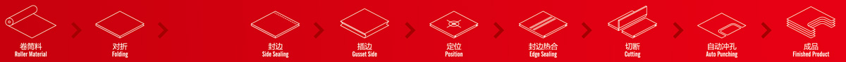 2.工序流程:卷筒料…折邊…穿繩…熱合…對(duì)折…插邊…定位…打孔…立體…熱合…切斷…沖口…收集成品。